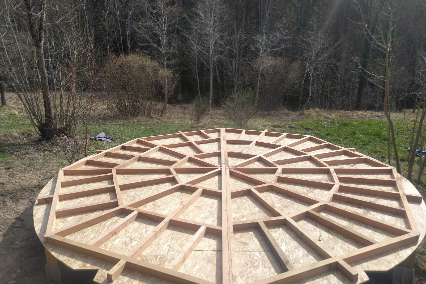 Technique : ossature octogonale avec 25 petits pieds, afin d’éviter les grosses sections de bois. Ici construite en 2 moitiés puis retournée avec un tracteur après la fixation de l’osb inférieur. En général, à construire en 8 triangles à assembler.